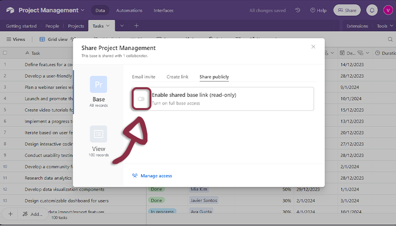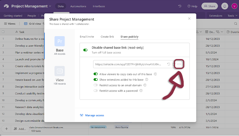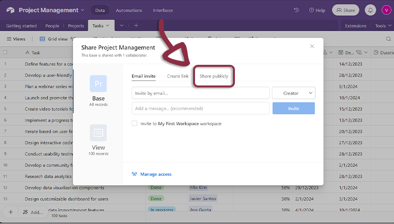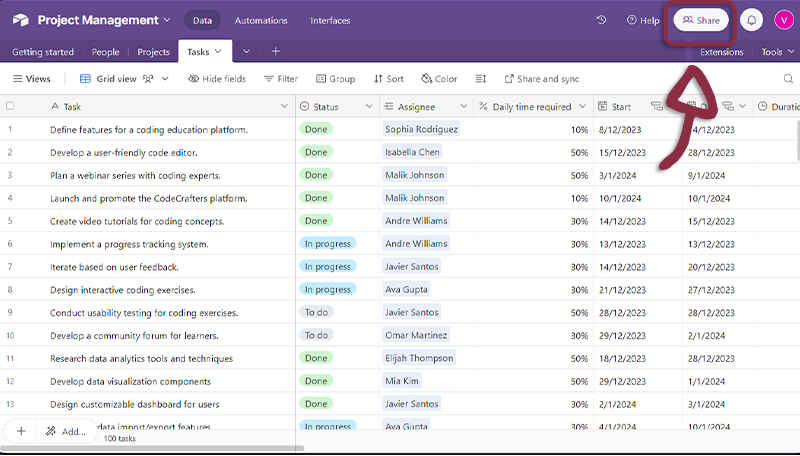 - Open Airtable, in the top right menu, click on the Share button.
