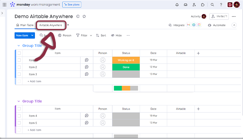 The Airtable Anywhere Integration for monday.com is a tool that allows users to embed Airtable directly into their monday.com Boards, Items, Dashboards or Workdocs. This integration streamlines collaboration, eliminates manual data entry, and allows users to customize the integration to their specific needs.