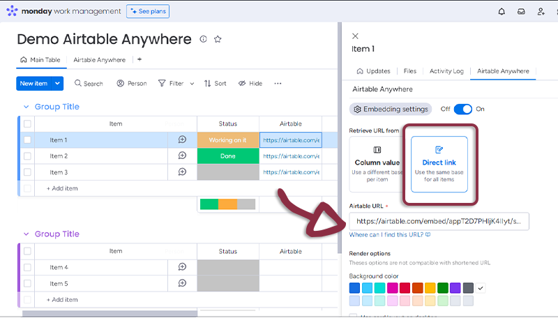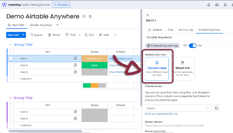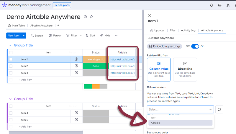 - In your board, add a column with all the links to the Airtable and in the Airtable Anywhere settings, select the column.