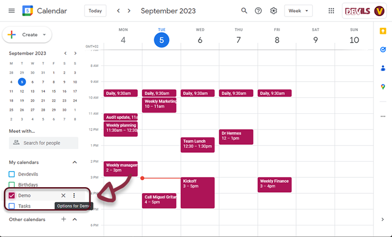 - Open Google Calendar, in the left sidebar, hover the desired calendar and click on the 3 dots