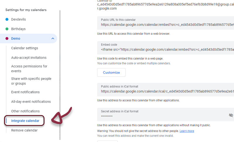 - Click on Integrate calendar
