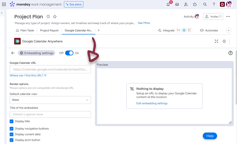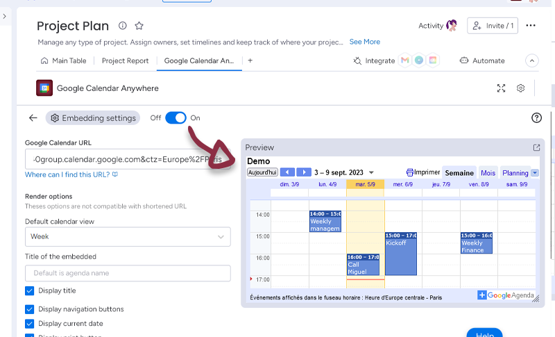 Once you have set-up your Calendar, just click the Save settings button to access to the Calendar embedded in monday.com