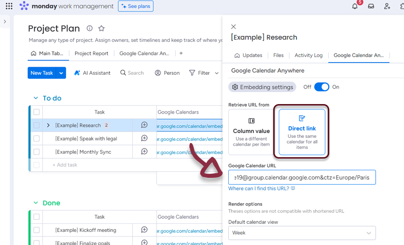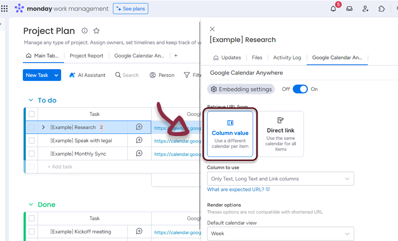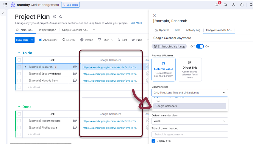 - In your board, add a column with all the links to the Google Calendars and in the Google Calendar Anywhere settings, select the column.