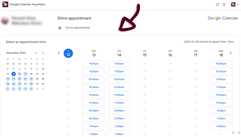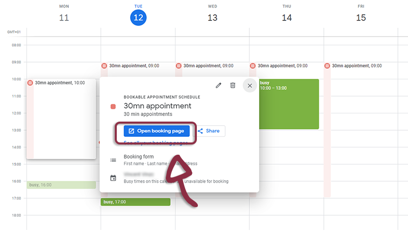 Once you have set-up the Appointement schedule (click here for tutorial), Click on the Open booking page button