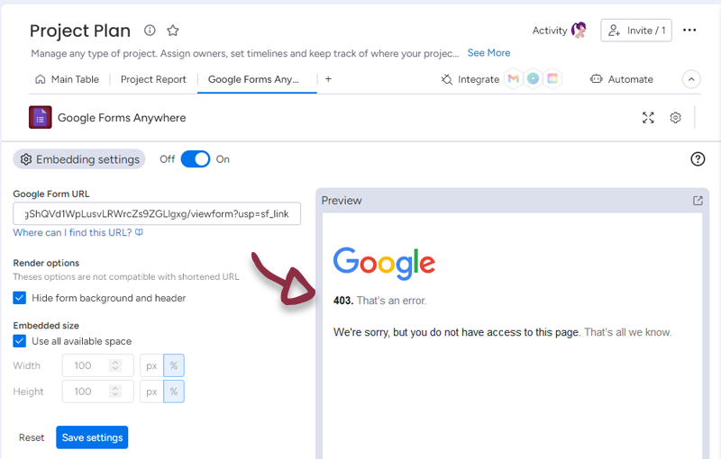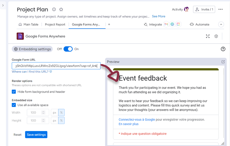 Once you have set-up your form, just click the Save settings button to access to the form embedded in monday.com