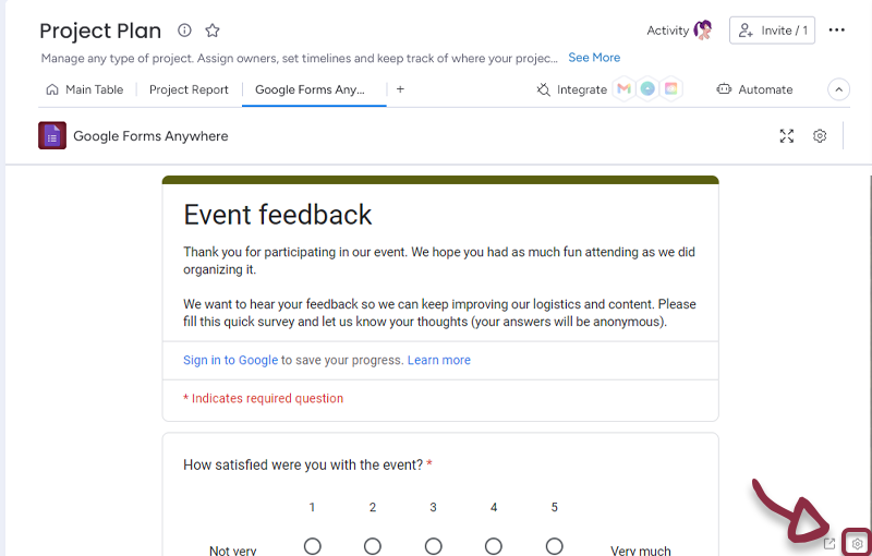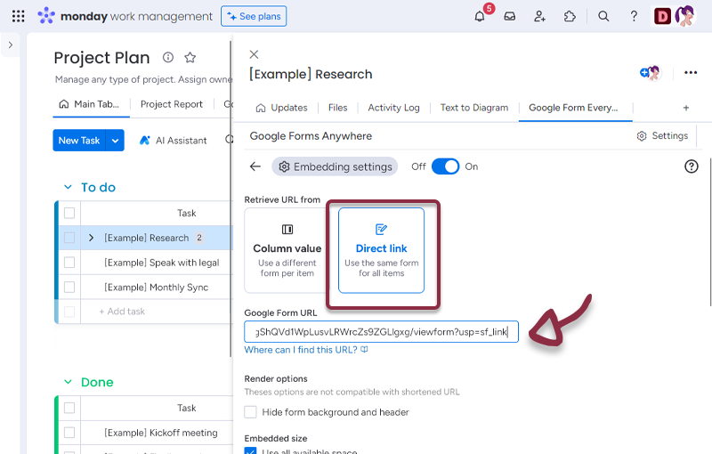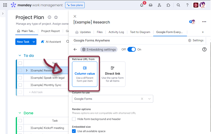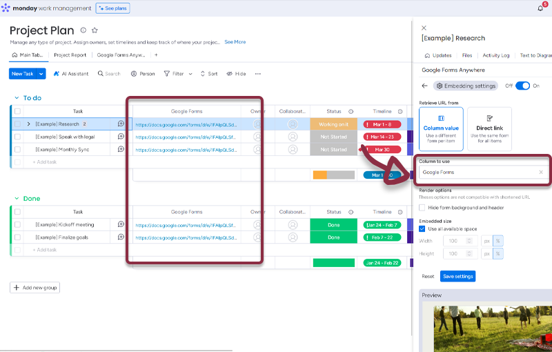 - In your board, add a column with all the links to the Google Forms and in the Google Forms Anywhere settings, select the column.