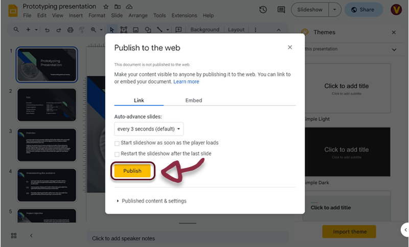 - Open Google Slides, in the top menu, click on File then Share and Publish to web.