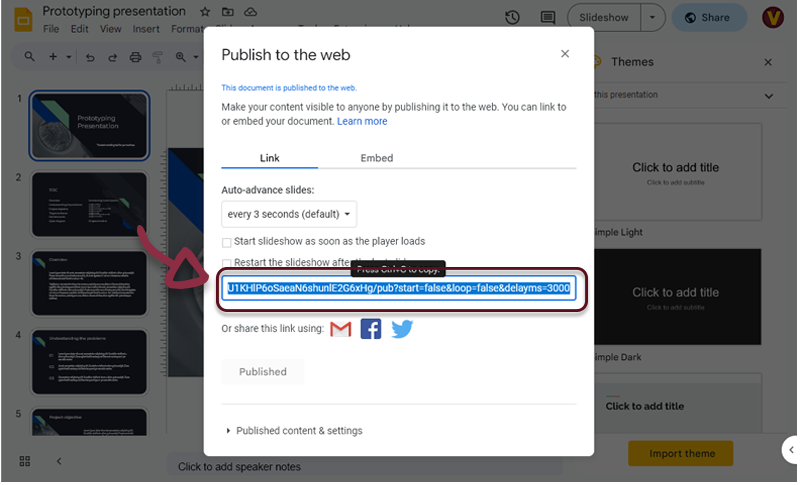 - Paste the link you copied from Google Slides in the dedicated space