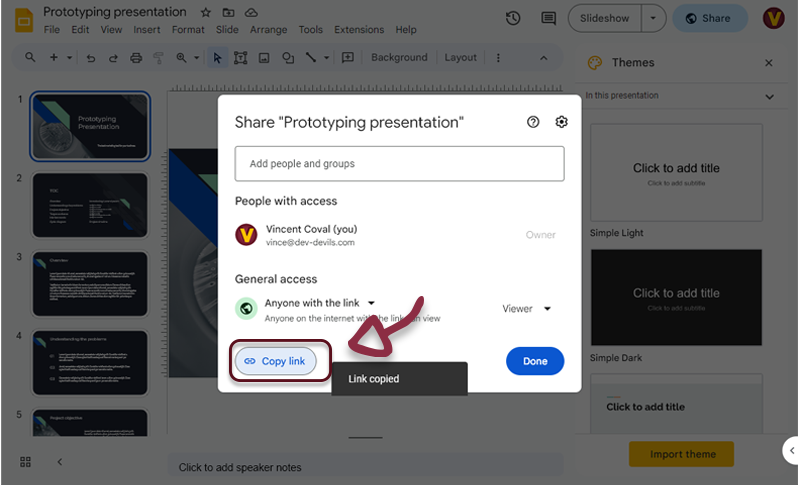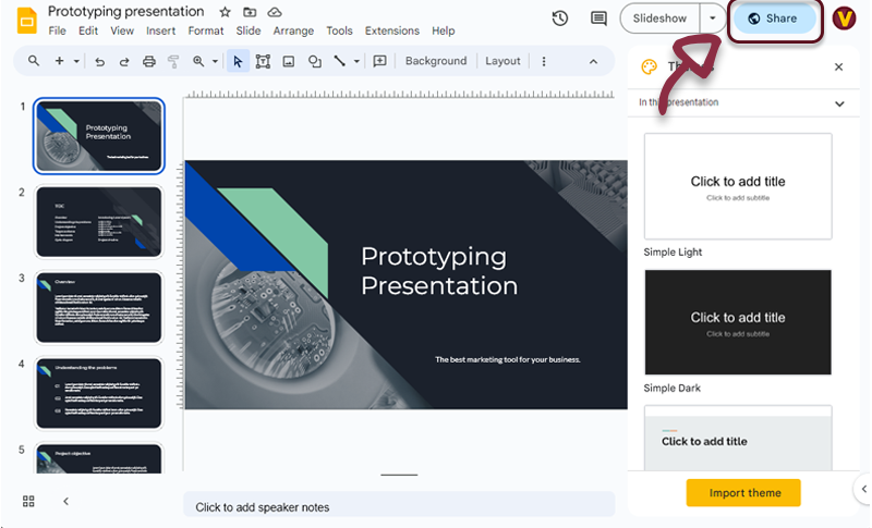 - Open Google Slides, in the top right menu, click on the Share button.