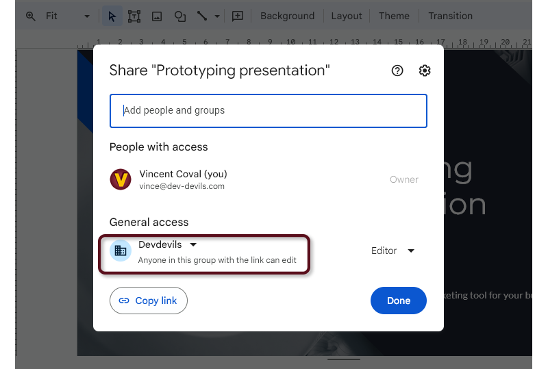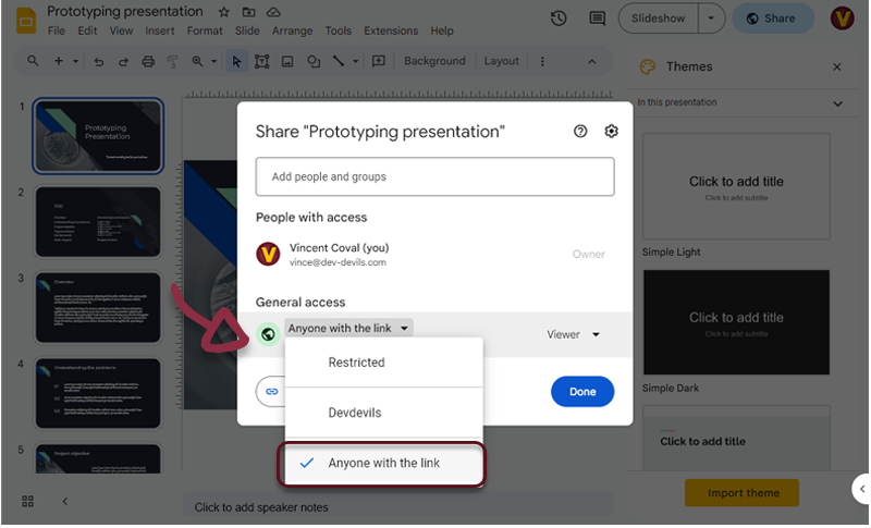 - If you are NOT using Google Chrome, be sure the General access option is set to Anyone with the link