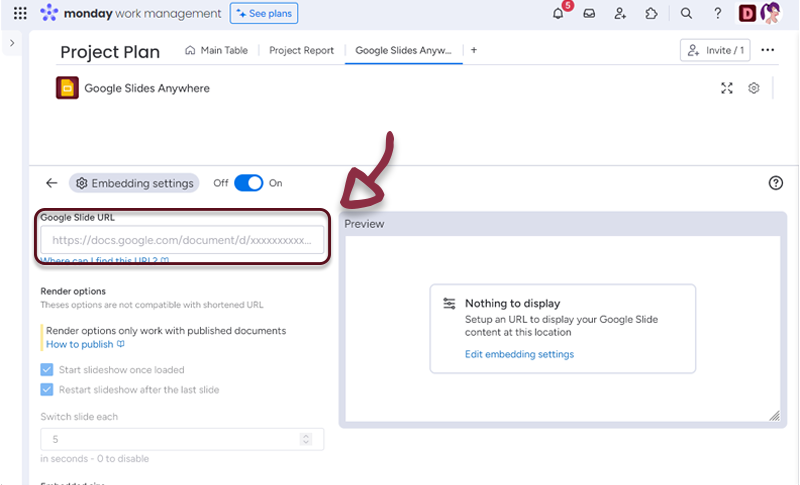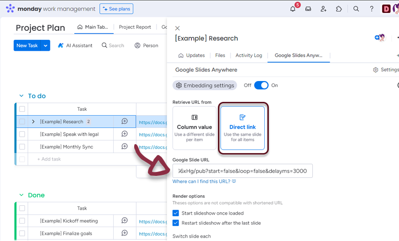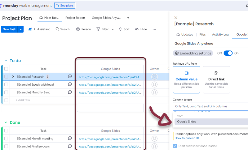 - In your board, add a column with all the links to the Google Slides and in the Google Slides Anywhere settings, select the column.