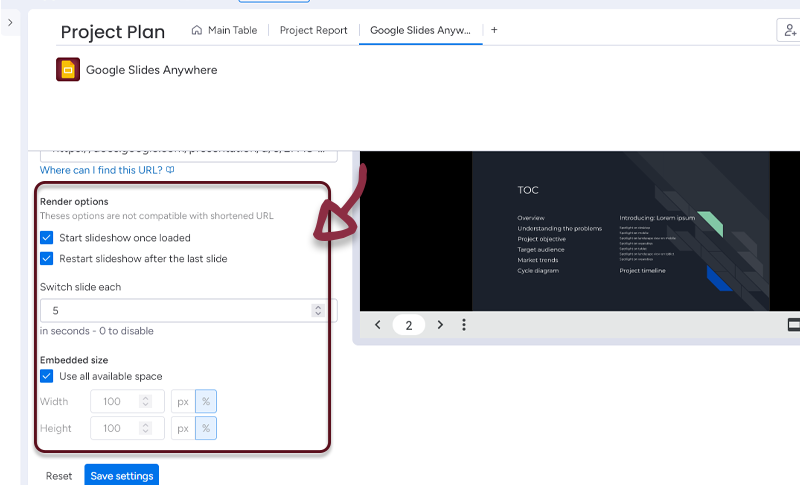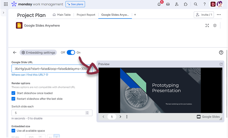 Once you have set-up your Slides, just click the Save settings button to access to the Doc embedded in monday.com