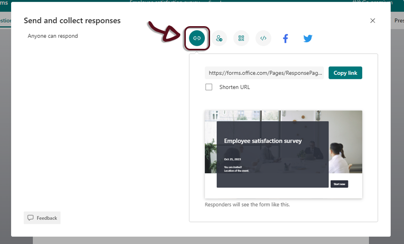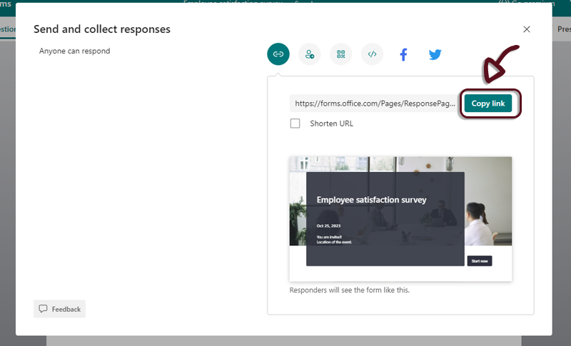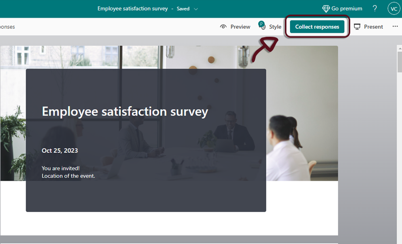 - On the Microsoft Form, click on the Collect responses button