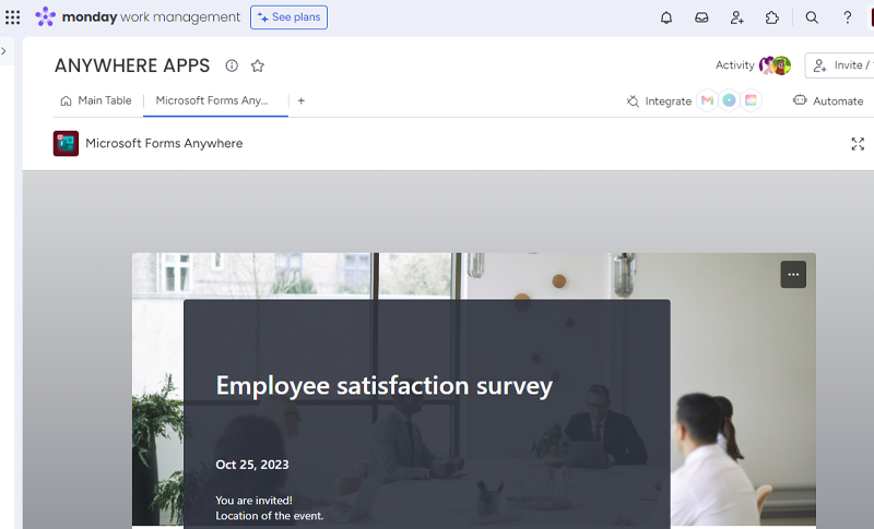 The Microsoft Forms Anywhere Integration for monday.com is a tool that allows users to embed Microsoft Forms directly into their monday.com Boards, Items, Dashboards or Workdocs. This integration streamlines collaboration, eliminates manual data entry, and allows users to customize the integration to their specific needs.