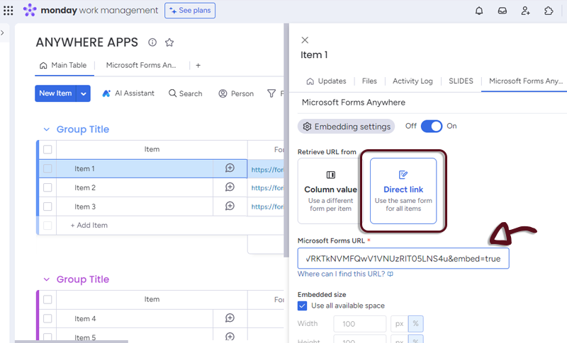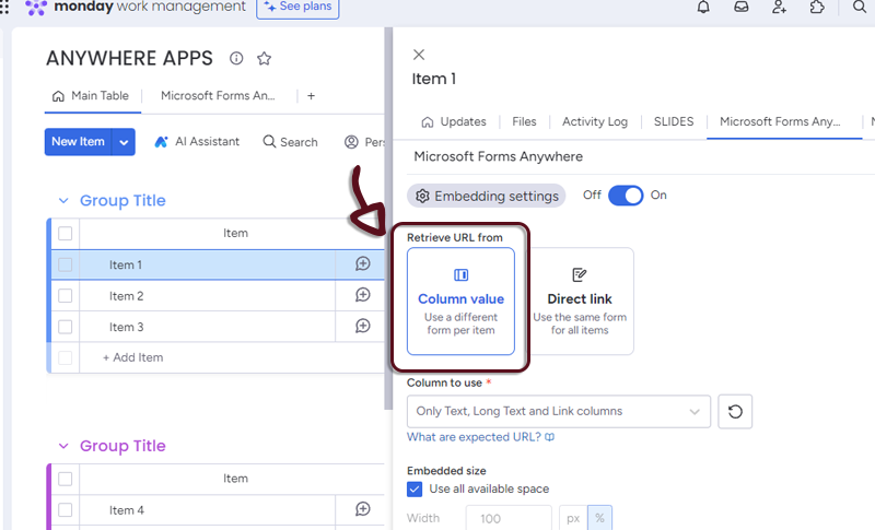 - In your board, add a column with all the links to the Microsoft Forms and in the Microsoft Forms Anywhere settings, select the column.