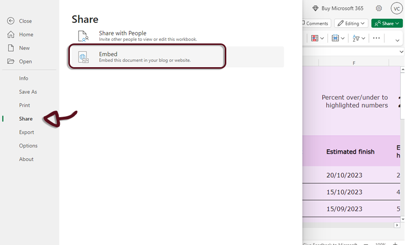 - Open Excel 365, in the top menu, click on File then Share and Embed.