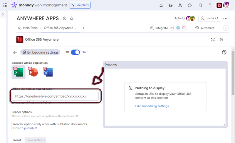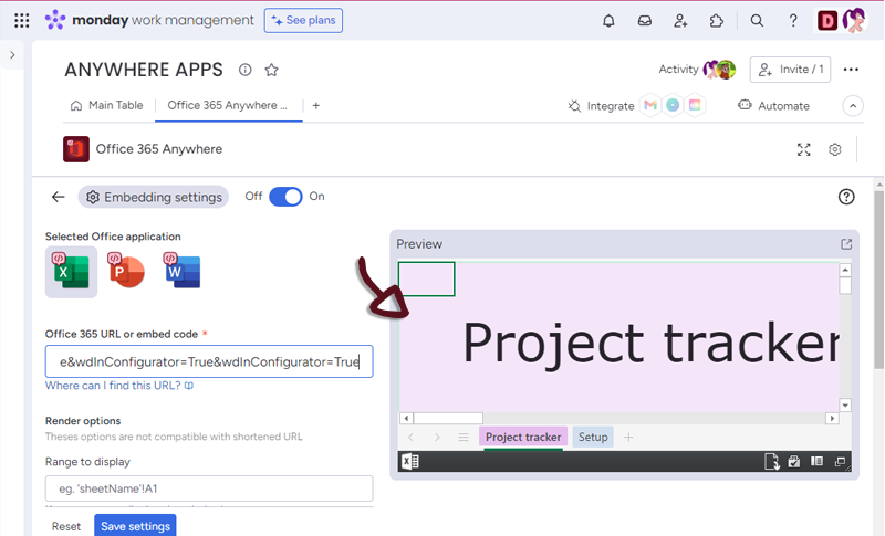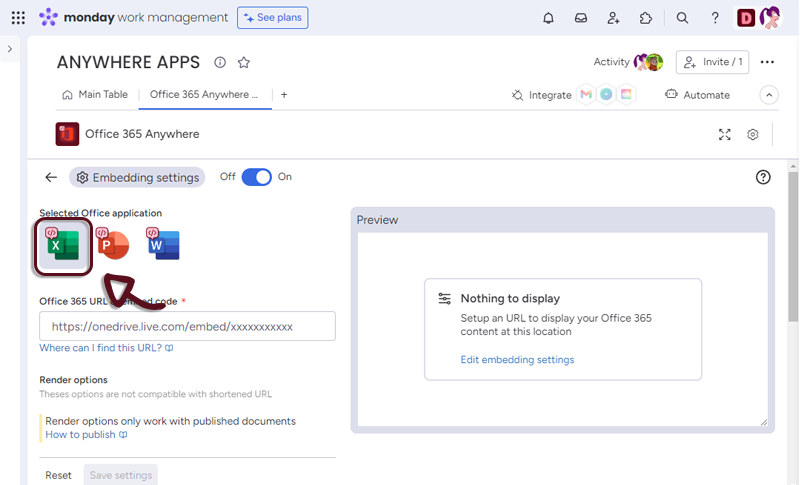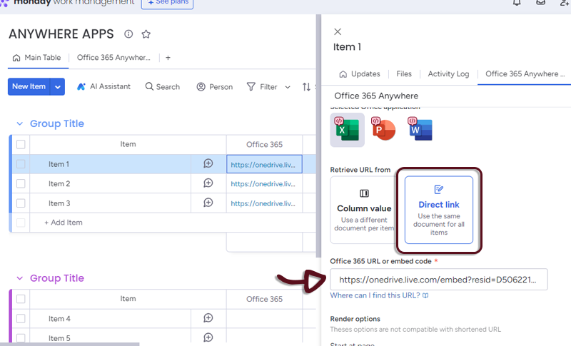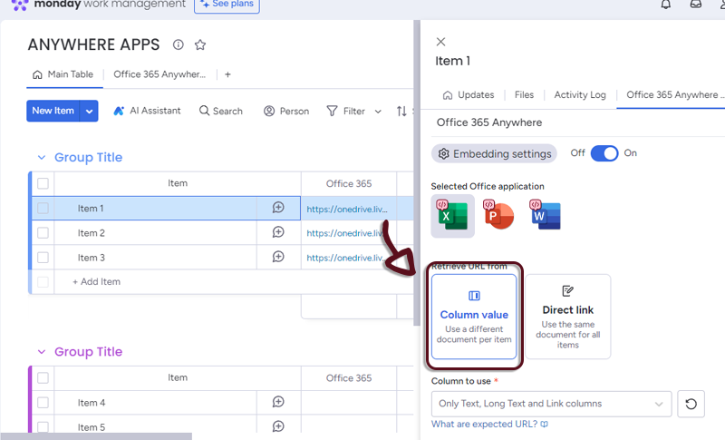 - In your board, add a column with all the links to the spreasheet and in the Office 365 Anywhere settings, select the column.