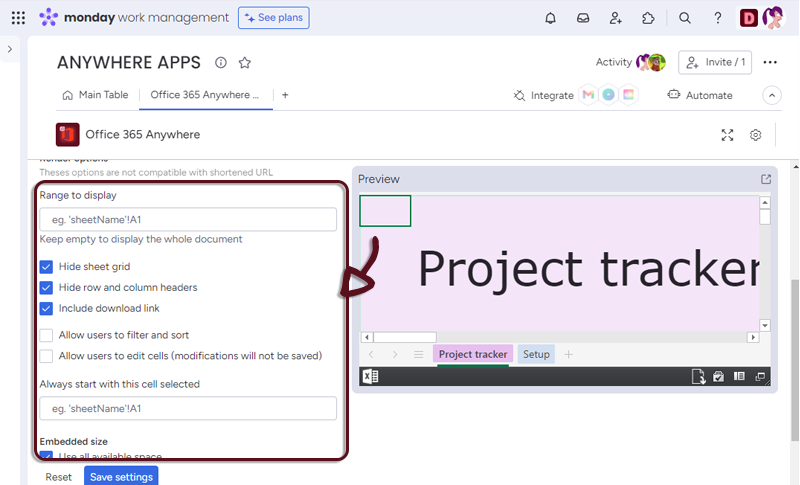 Once you have set-up your Document, just click the Save settings button to access to the Excel embedded in monday.com