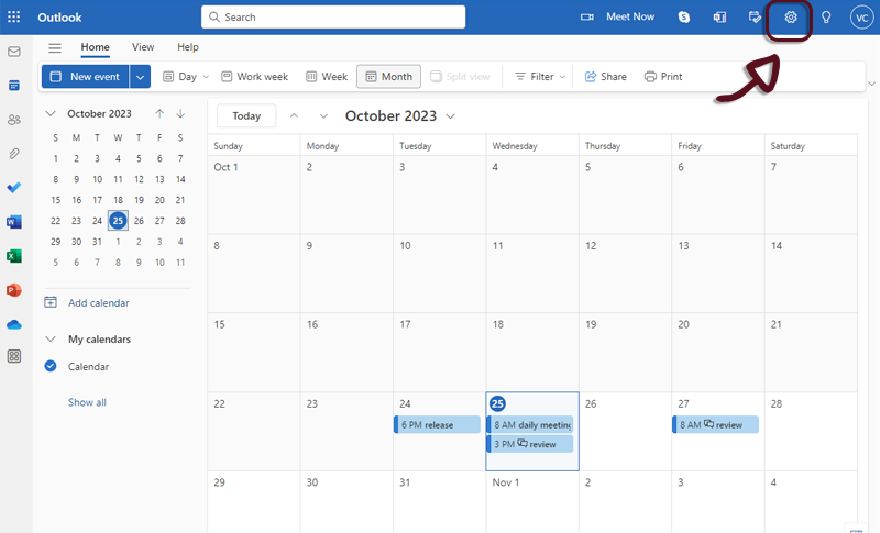 - Open Outlook Calendar, in the top right corner, click on the toothed wheel