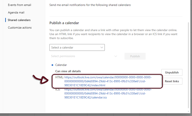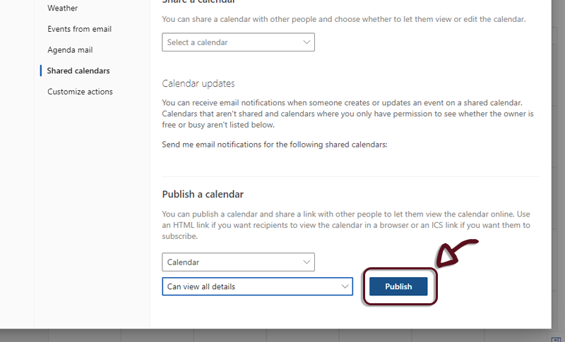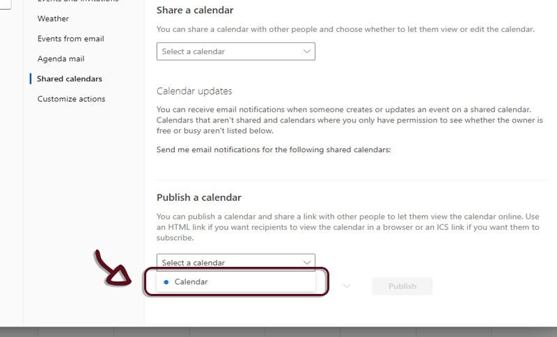 - In the Publish a calendar section, select the calendar you want to publish