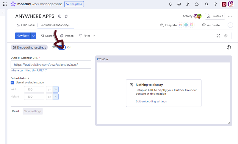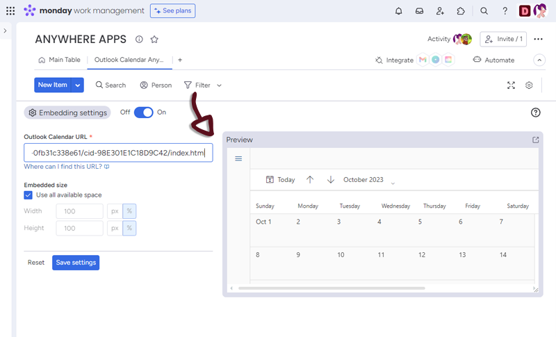 Once you have set-up your Calendar, just click the Save settings button to access to the Calendar embedded in monday.com