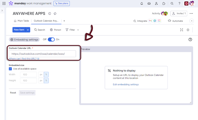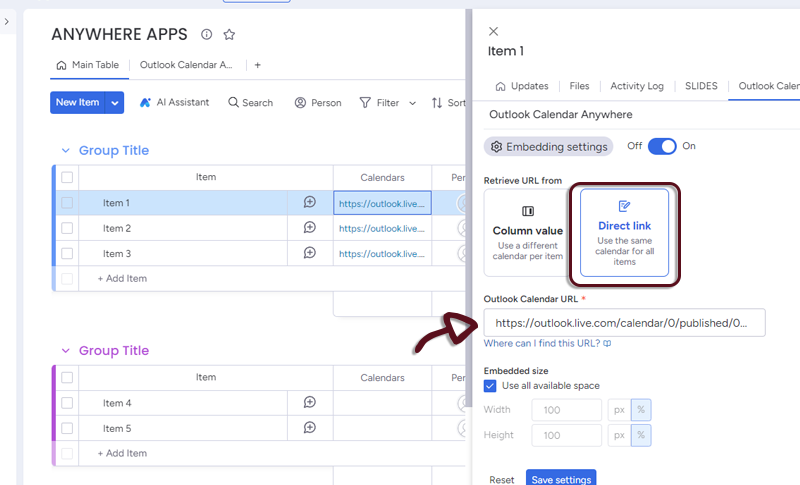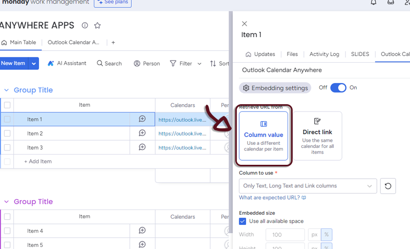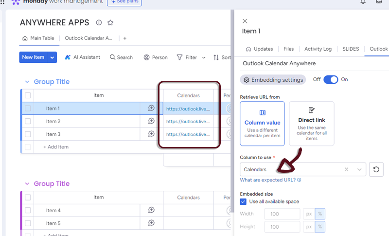 - In your board, add a column with all the links to the Outlook Calendars and in the Outlook Calendar Anywhere settings, select the column.