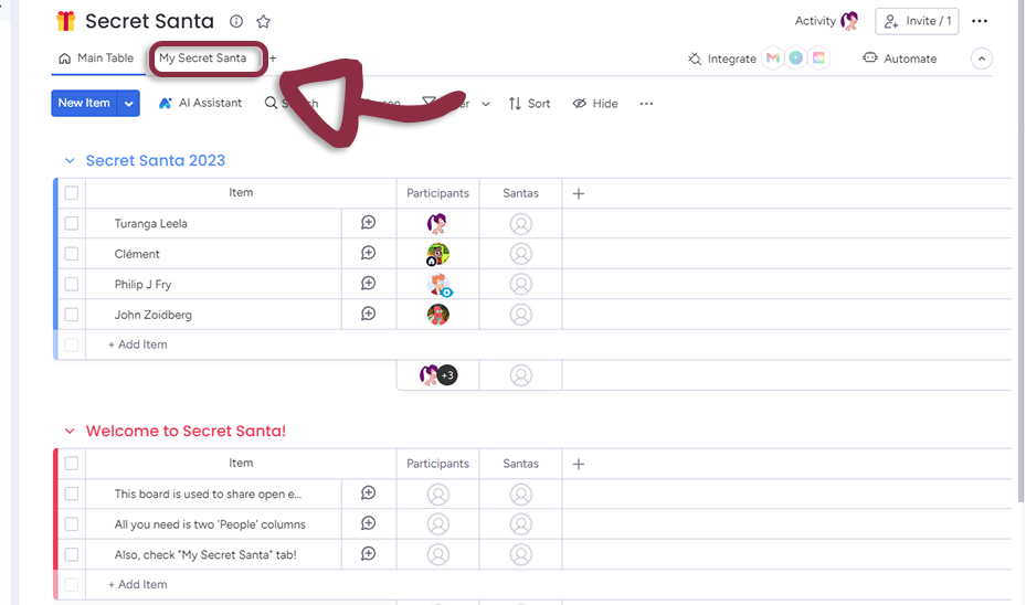 - Navigate to your monday.com Workspace and open the Secret Santa Board