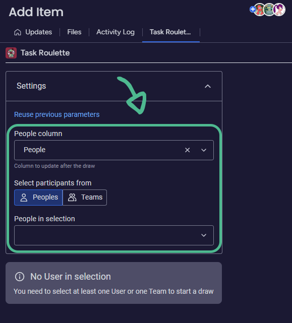 Before using Task Roulette, you need to select what >People Column you want to assign people to and chose values to fill the list.